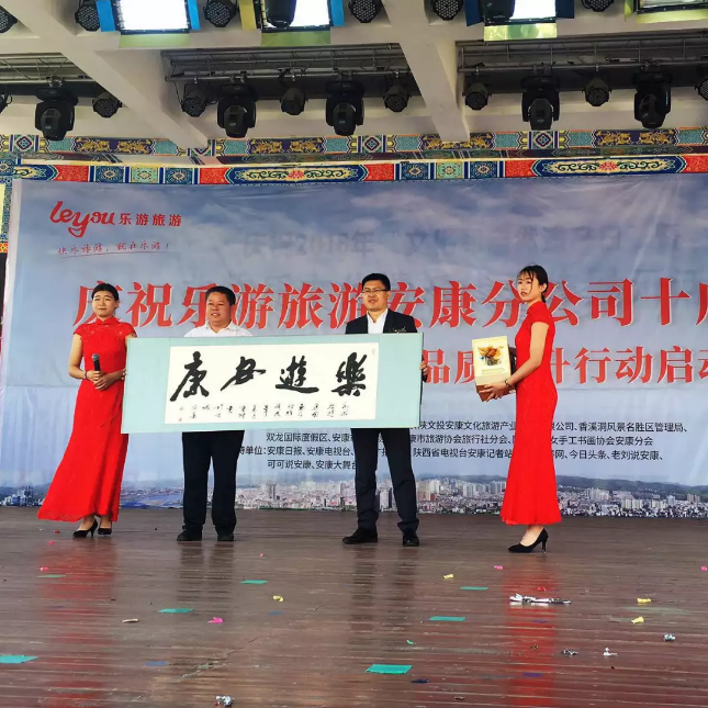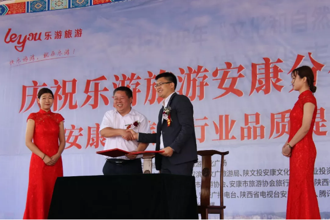 ⊙ 安康市旅游發(fā)展委員會曹輝局長與樂游旅游集團(tuán)李永生總裁簽訂《安康市旅發(fā)委與樂游旅游集團(tuán)旅游產(chǎn)品開發(fā)及招商引資戰(zhàn)略合作協(xié)議》、并互贈紀(jì)念品